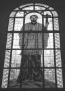 Gambar 5. Lukisan kaca sebagai unsur dekoratif dan patung Maria-bayi Yesus, sebagai simbol orang Kudus, merangsang penghormatan umat kepada Allah melalui tokoh tersebut (Foto : Dokumentasi penulis, 2006).