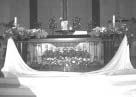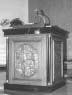Gambar 6. Kiri : altar gereja sebagai pusat dalam ruang. Tampak relief di depan altar mengingatkan umat tentang perjamuan Yesus bersama murid-muridNya. Lilin di atas altar merupakan simbol dari firman Tuhan ‘Akulah Terang Dunia’. Dua lilin mewakili naturNya sebagai manusia dan Allah. Kanan : mimbar khusus untuk membacakan sabda Tuhan. Tampak di depan mimbar terdapat ukiran orang-orang kudus. (Foto : Dokumentasi penulis, 2006)