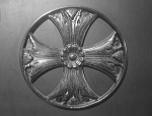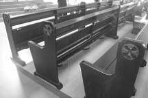 Gambar 7. Kiri : kursi umat, mewadahi aktivitas simbolik umat, duduk dan berlutut, mengambil sikap doa, dll. Kanan : stilasi pola struktur salib Yunani (semua sisi sama panjang) sebagai elemen dekoratif pada kursi umat. Salib merupakan lambang pengorbanan jiwa dan raga Kristus demi umat manusia. (Foto : Dokumentasi penulis, 2006).